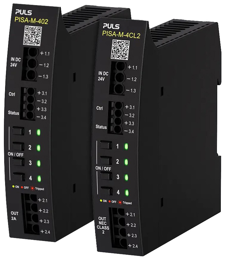 PULS PISA-M 4-channel electronic circuit breakers have a space-saving footprint. PISA-M DIN rail mountable 4-channel protection modules with integrated electronic fuses are ideal for 12 V or 24 V systems. They distribute the current of a power supply to four output channels, each of lower current. If an overload or short condition occurs on one or more channels, the channel is tripped to protect and maintain the other loads, as well as the primary 24 VDC power supply from overloading. One of the standout features of the PISA-M units is their extremely compact design: only 22.5 mm wide (22.5 mm x 104 mm x 98 mm). This ultra-slim profile allows it to fit easily into densely packed control cabinets, freeing up valuable space for other critical system components.